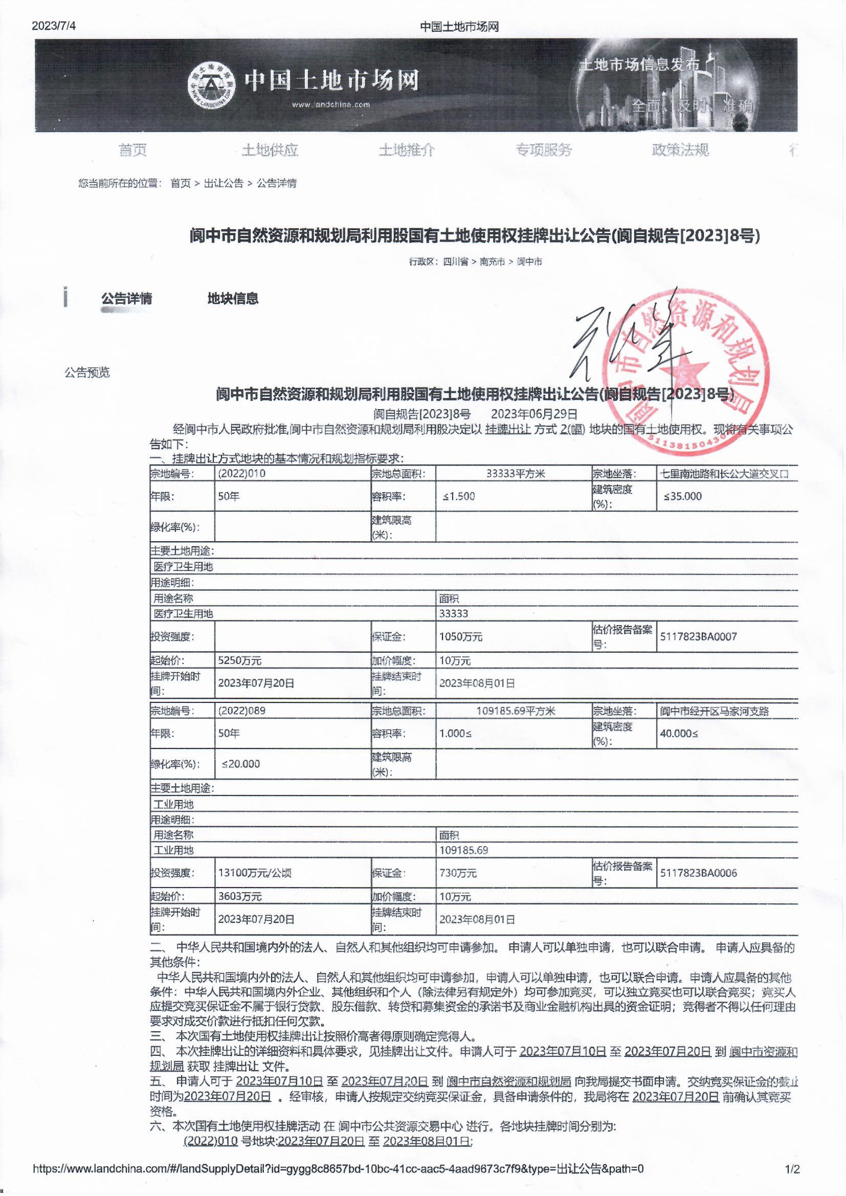 閬中市自然資源和規(guī)劃局利用股國(guó)有土地使用權(quán)掛牌出讓公告(閬?zhàn)砸?guī)告[2023]8號(hào))