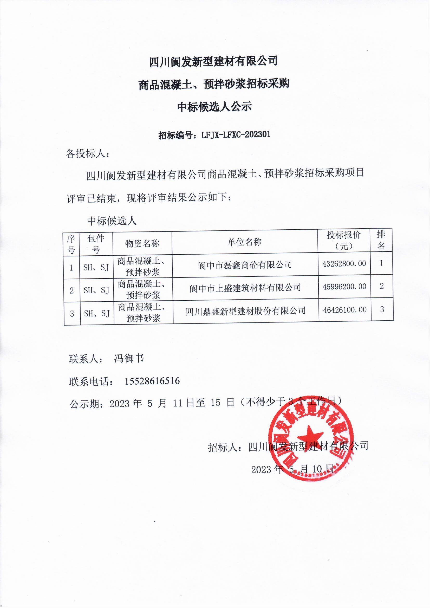 四川閬發(fā)新型建材有限公司商品混凝土、預(yù)拌砂漿招標(biāo)采購中標(biāo)候選人公示